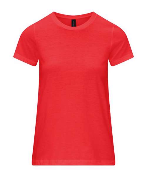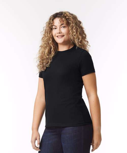 Made with our soft ringspun cotton blend, the Softstyle™ CVC women’s t-shirt features high stitch density for a smoother printing surface. Soft ringspun fabric feels great against your skin. Non-topstitched, narrow width, rib collar. Taped neck and shoulders for comfort and durability. Semi-fitted A-Line shape with side-seamed body. High-performing black tear-away label.